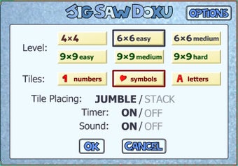 La variedad de Jig Saw Doku se encuentra en su apartado Options, donde podrás cambiar el tamaño de la rejilla y la figura de las piezas entre números, letras o símbolos. Sean cuales sean, el resto mental que te propone el juego es el mismo. ¿Podrás superarlo?